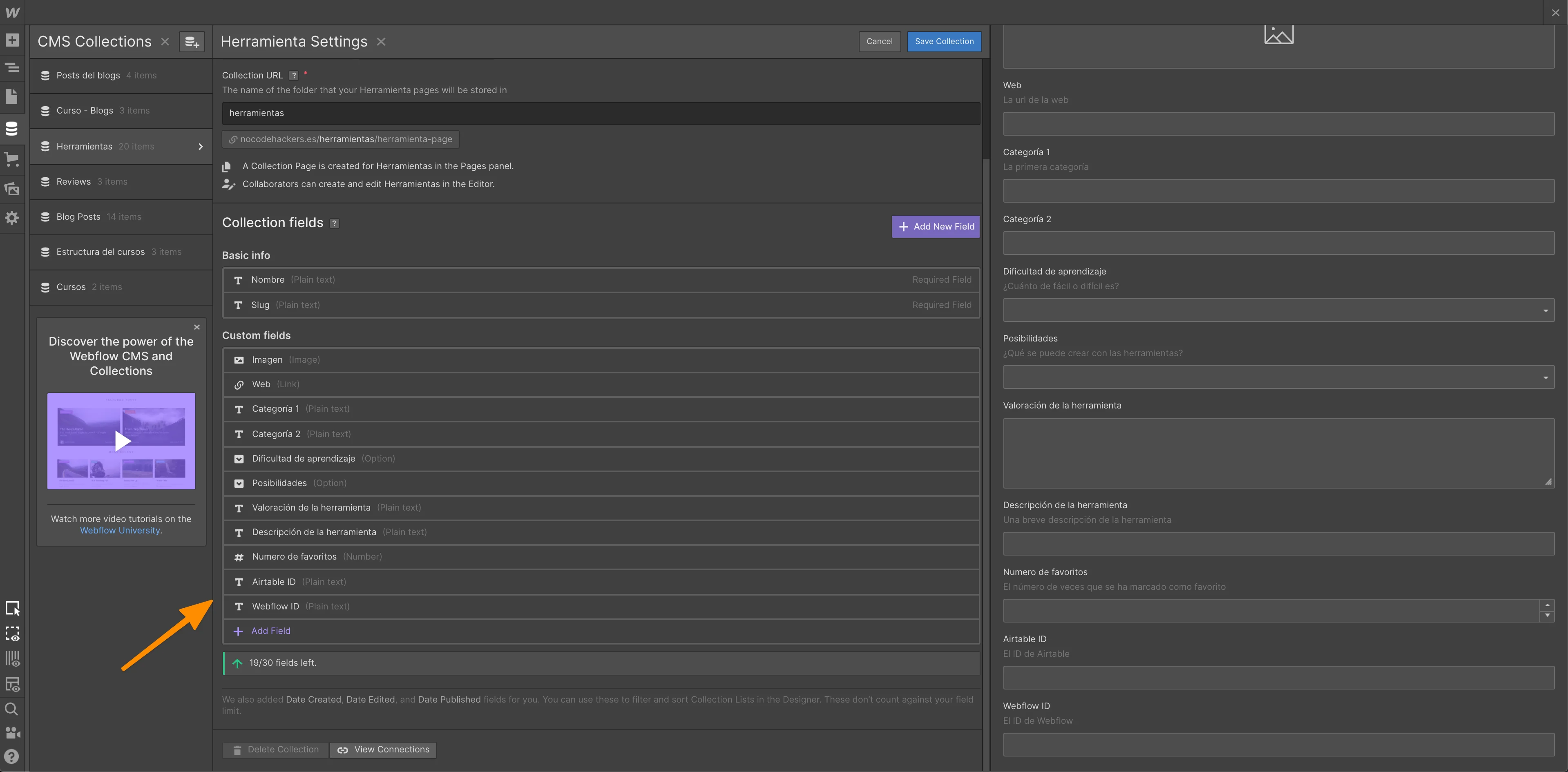 Para vincular el Webflow ID, es un poco más complejo, ya que deberemos añadírselo tanto a Airtable como a Webflow.